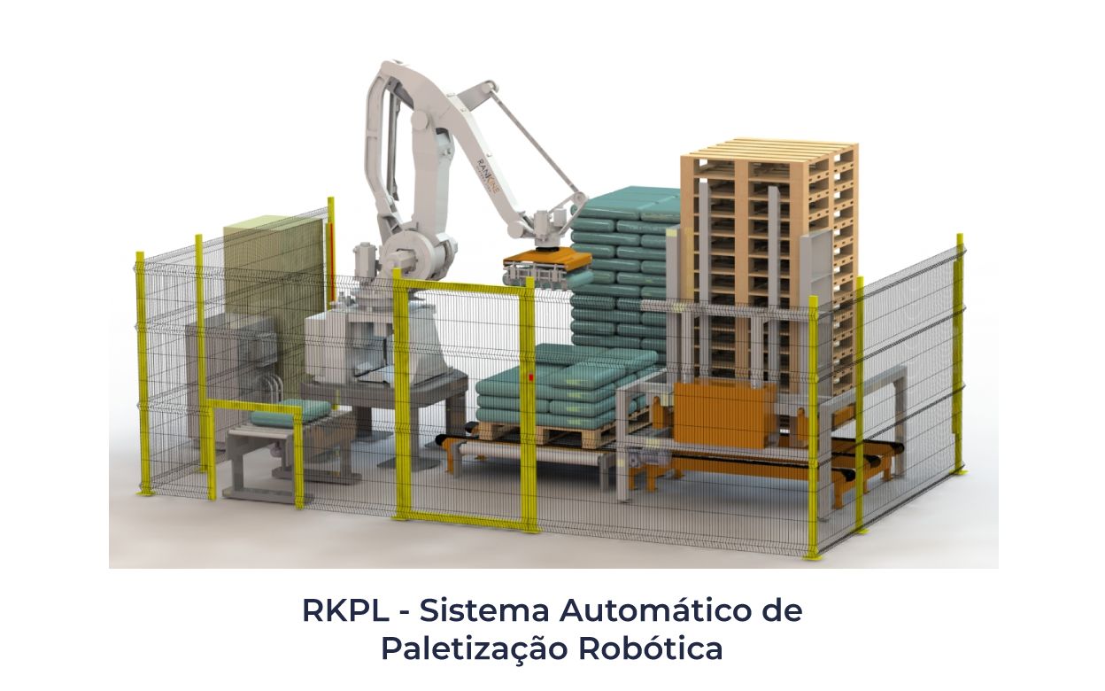 O modelo RKPC, robô cartesiano que possui um conjunto de eixos em “XYZ”, que interpolados em uma lógica de controle através dos controladores de movimento, formam uma cinemática perfeita para o processo de paletização. Todos os dois sistemas manuseiam qualquer tipo de ensacado, caixa ou fardo.